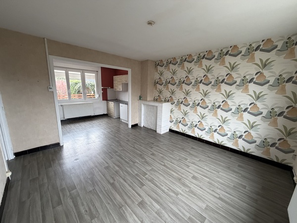 Cette maison mitoyenne de 79,72 m² se compose au rez-de-chaussée d’une entrée, d’un WC, d’un salon-séjour et d’une cuisine.